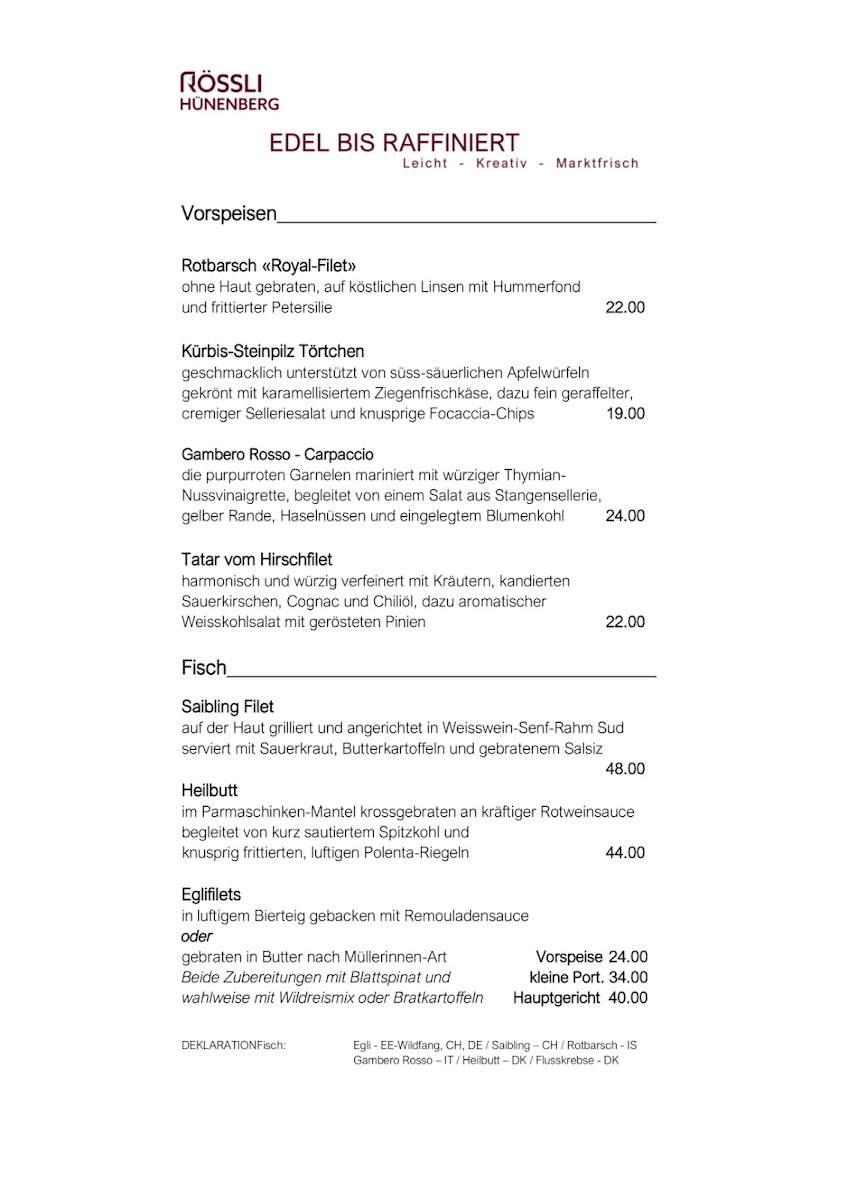 Welcome to Rössli Hünenberg, a culinary gem nestled in the picturesque town of Hünenberg, Switzerland. This charming restaurant offers a menu that celebrates seasonal flavors with dishes like the fruchtige CurrySchaumsuppe and the delightful KürbisOrangen Cremesuppe, priced between CHF 22.00 and CHF 39.00. Their hallmark specialties, like the Eglifilets in crispy beer batter or the Angus Bratwurst paired with a savory onion sauce, promise an unforgettable dining experience.